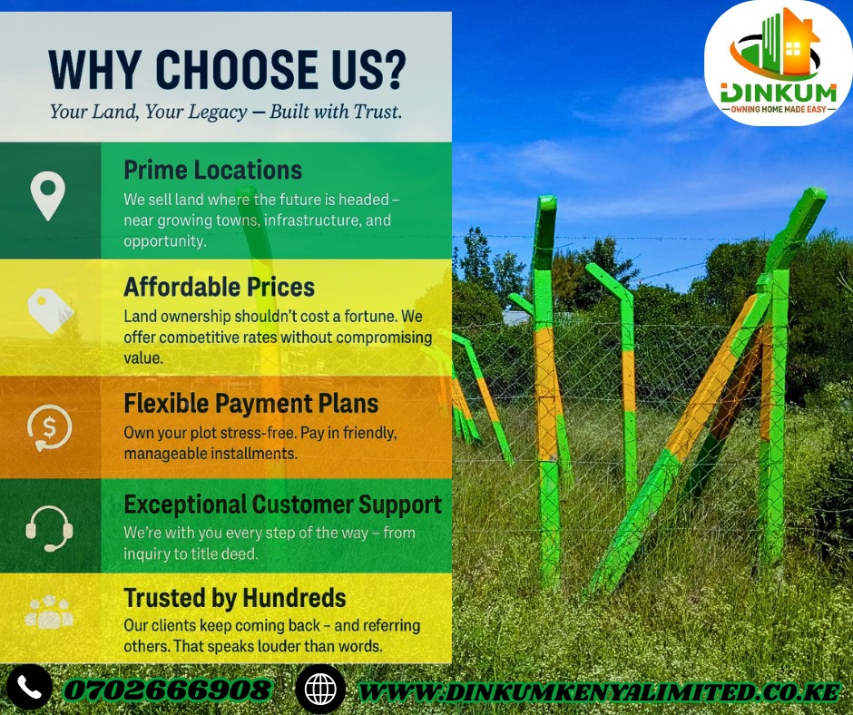At Dinkum Kenya Limited, we make land ownership in Kenya simple, secure, and stress-free. We are a trusted real estate company committed to helping Kenyans and investors acquire genuine, well-documented land at affordable prices.